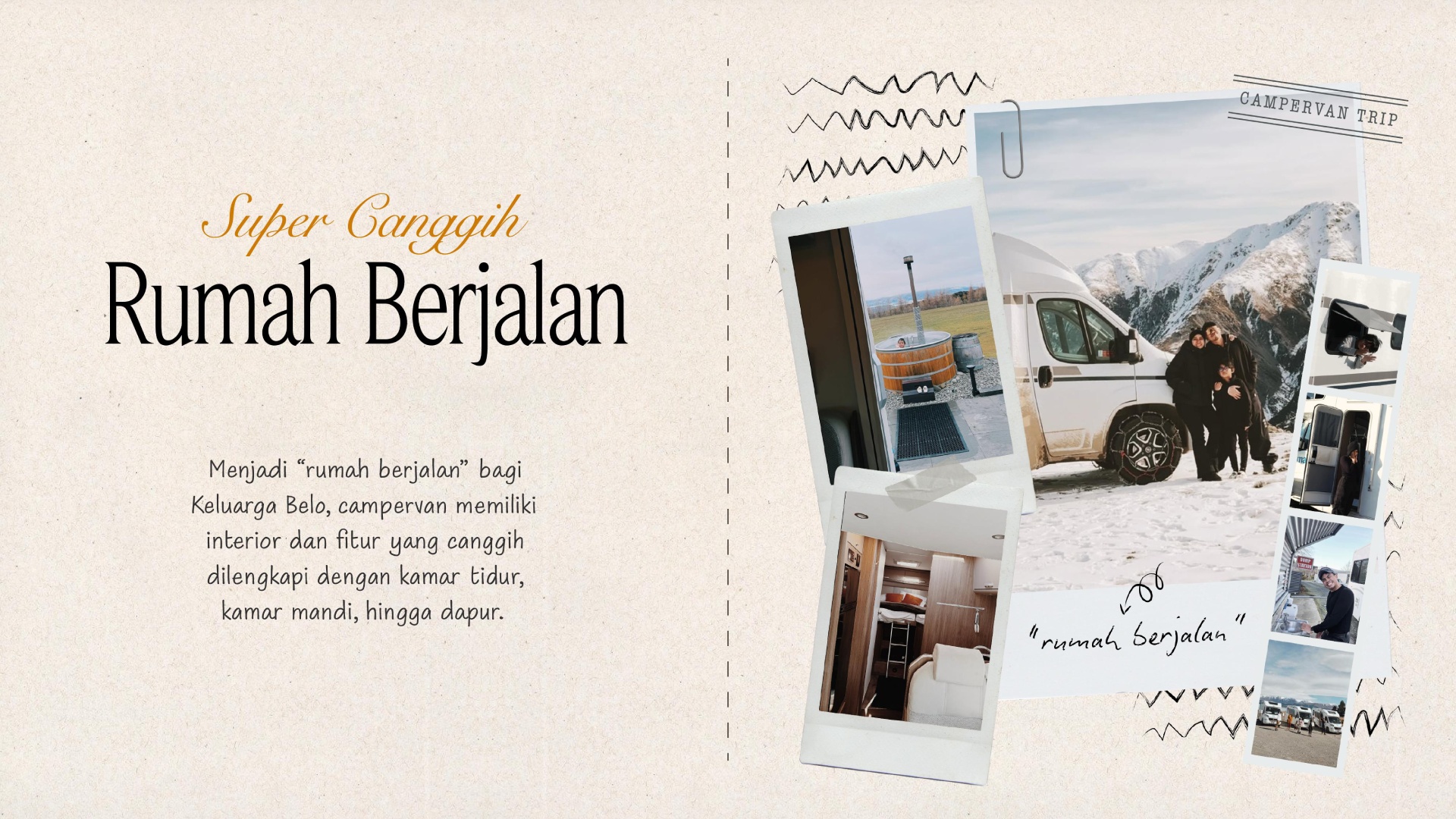 Campervan memiliki fasilitas dan interior seperti dua tempat tidur (bunk beds), kamar mandi dengan shower, toilet, dan poo powder, dapur dengan kulkas, kompor gas, wastafel, oven, hingga microwave, serta TV